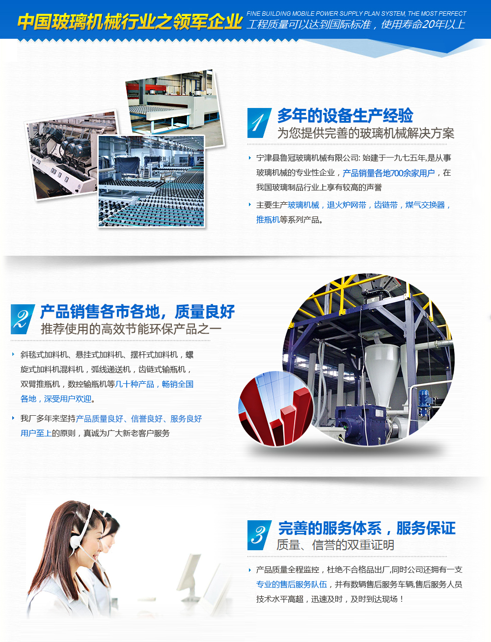 山東魯冠玻璃機(jī)械有限公司,是從事玻璃機(jī)械的專注性企業(yè),產(chǎn)品行銷各地700余家用戶,在我國玻璃制品行業(yè)上享有較高的聲譽(yù)。目前主要生產(chǎn)玻璃加料機(jī),玻璃混料機(jī),煤氣交換器,玻璃原料自動(dòng)配料等玻璃機(jī)械設(shè)備。此外,我公司具備良好的整體素質(zhì)和渾厚的技術(shù)力量,制造工藝完善,設(shè)備完善,具備完善的質(zhì)量管理和質(zhì)量檢測體系。企業(yè)堅(jiān)持“科學(xué)技術(shù)是主要生產(chǎn)力”的主導(dǎo)思想,不斷加強(qiáng)新產(chǎn)品研發(fā)力度,玻璃機(jī)械產(chǎn)品的開發(fā)生產(chǎn),為適應(yīng)玻璃制品行業(yè)發(fā)展需要,相繼先后研制出:斜毯式加料機(jī)、懸掛式加料機(jī)、強(qiáng)制式混合機(jī)等幾十種產(chǎn)品,銷售各地,深受用戶歡迎。 我公司產(chǎn)品已實(shí)現(xiàn):網(wǎng)帶鏈條、玻璃機(jī)械、輸送機(jī)械、玻璃原料自動(dòng)混配、食品機(jī)械五大系列。我公司多年來堅(jiān)持“用戶至上”的原則,真誠為廣大新老客戶服務(wù),竭誠歡迎廣大新老客戶光臨惠顧!